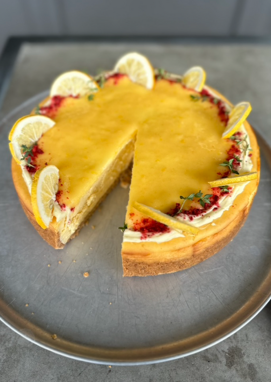 A Classic Italian Baked Lemon Cheesecake topped with whipped sour cream and silky lemon curd. Size...