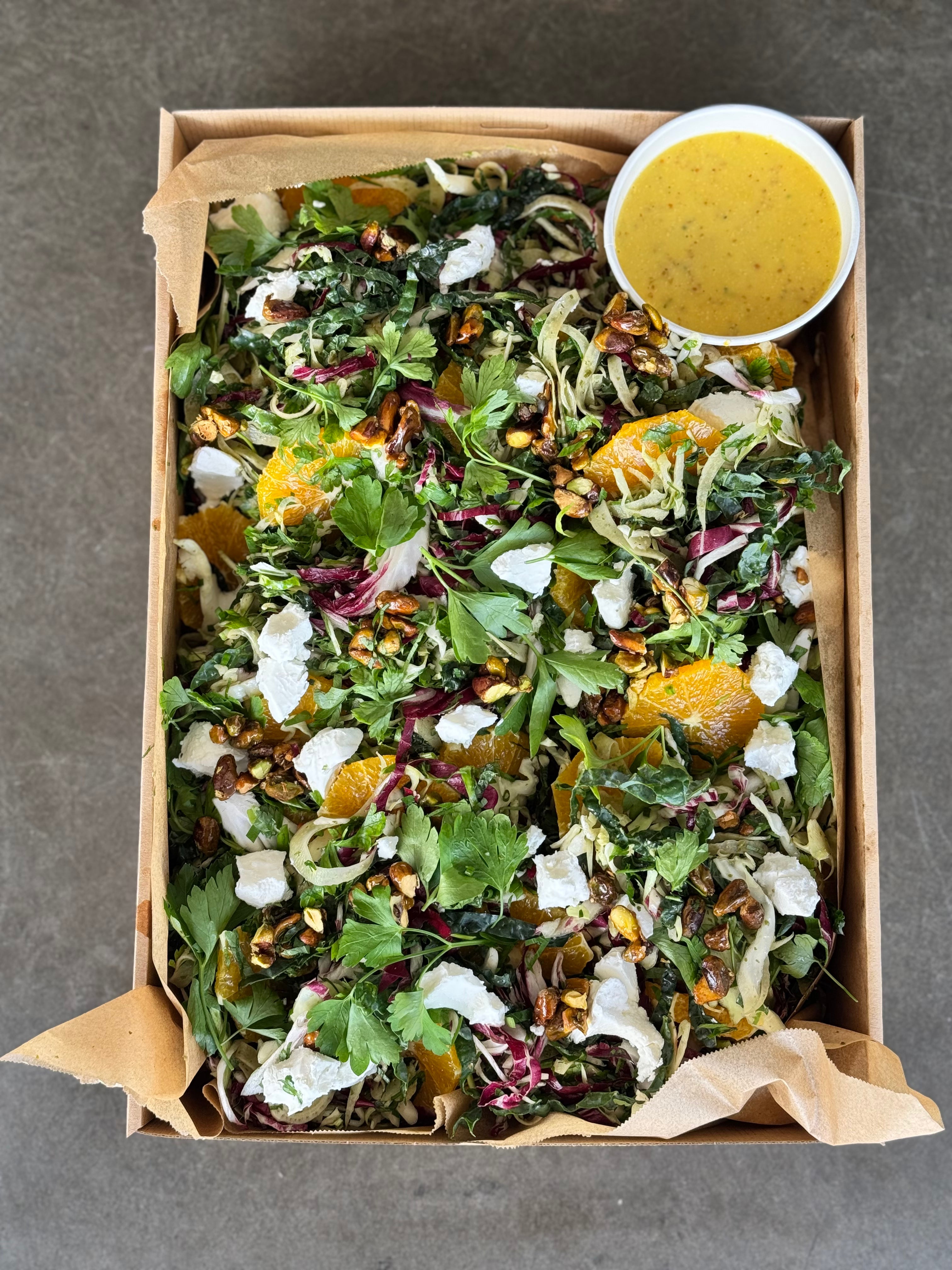 FRESH FENNEL SLAW: Shaved fennel, cabbage, parsley, chive, radicchio, kale, orange, pistachio nuts, goat's cheese, and honey Dijon vinaigrette . CONTAINS: Nuts (pistachio), Dairy, Sulphites, Honey. MADE WITHOUT: Gluten