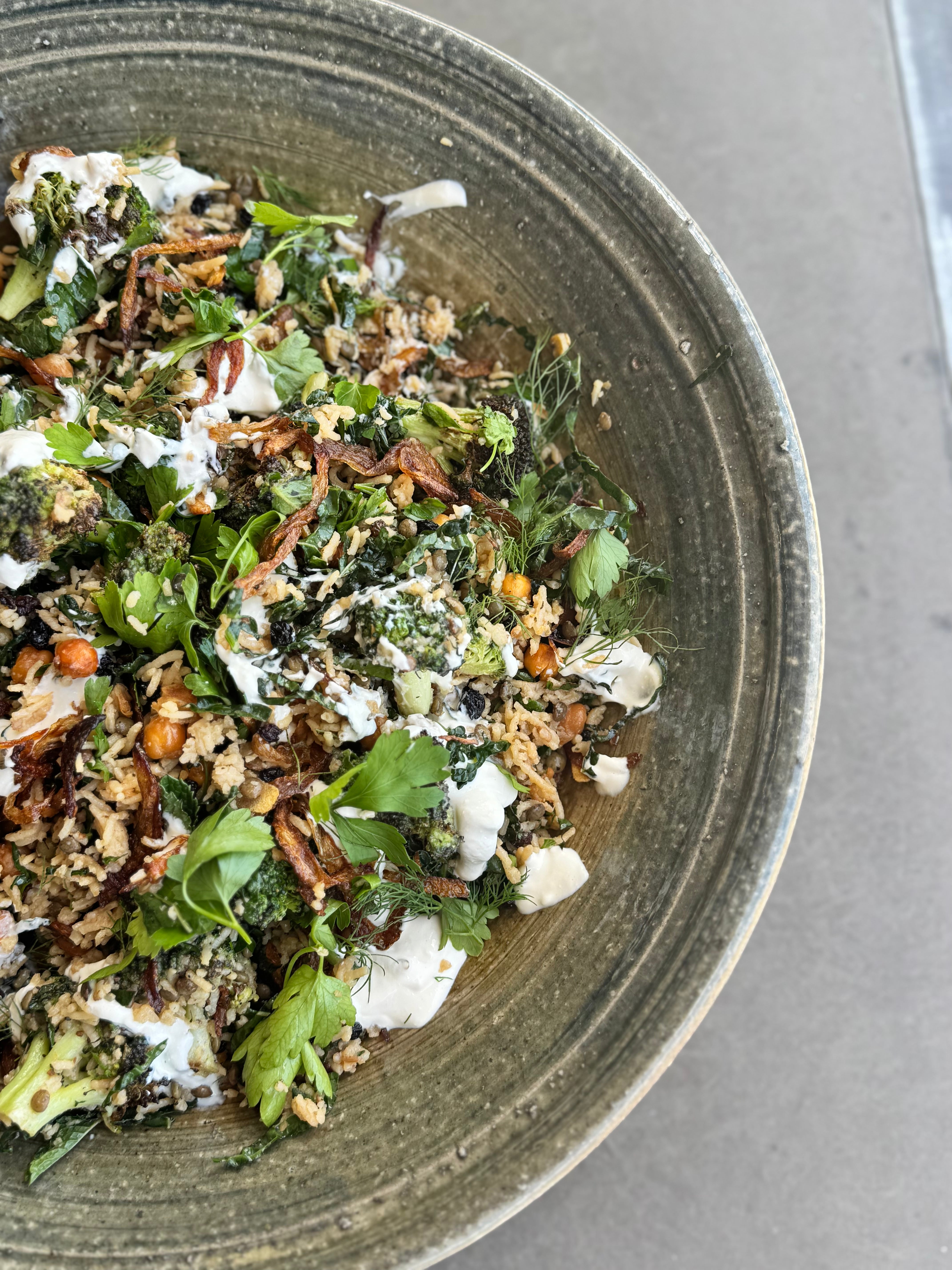 TAHINI CHARRED BROCCOLI PILAF: Broccoli, tahini, rice, onion, garlic, chickpeas, lentils, cavolo Nero, parsley, mint, currants, tahini yogurt dressing. CONTAINS: Dairy, Sesame, Sulphites MADE WITHOUT: Gluten, Nuts
