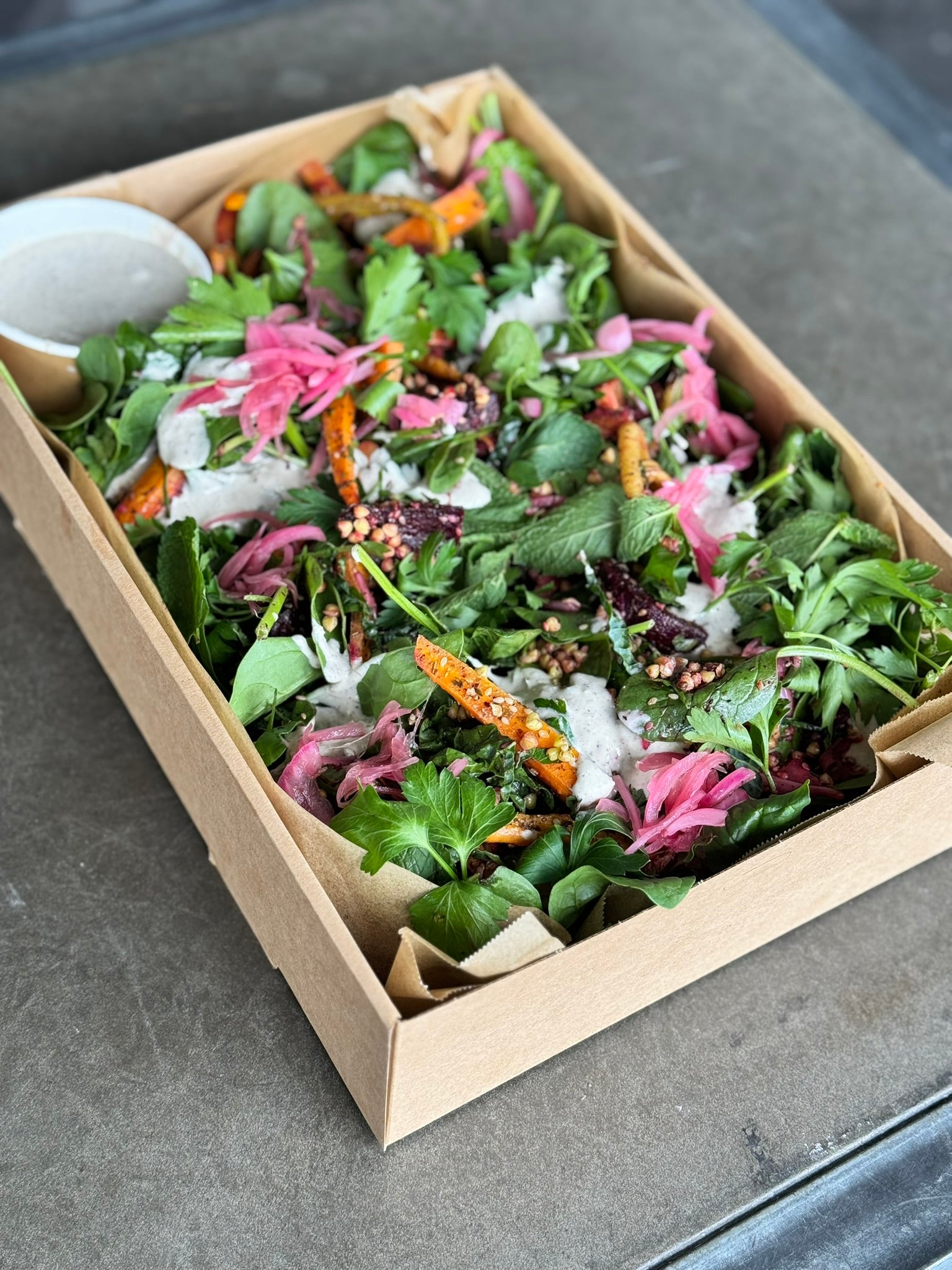 ZA’ATAR ROOTS: Beetroot, carrot, buckwheat, parsley, mint, kale, spinach, red onion, tahini whip. CONTAINS: Sesame, Sulphites MADE WITHOUT: Gluten, Dairy, Nuts – VEGAN FRIENDLY