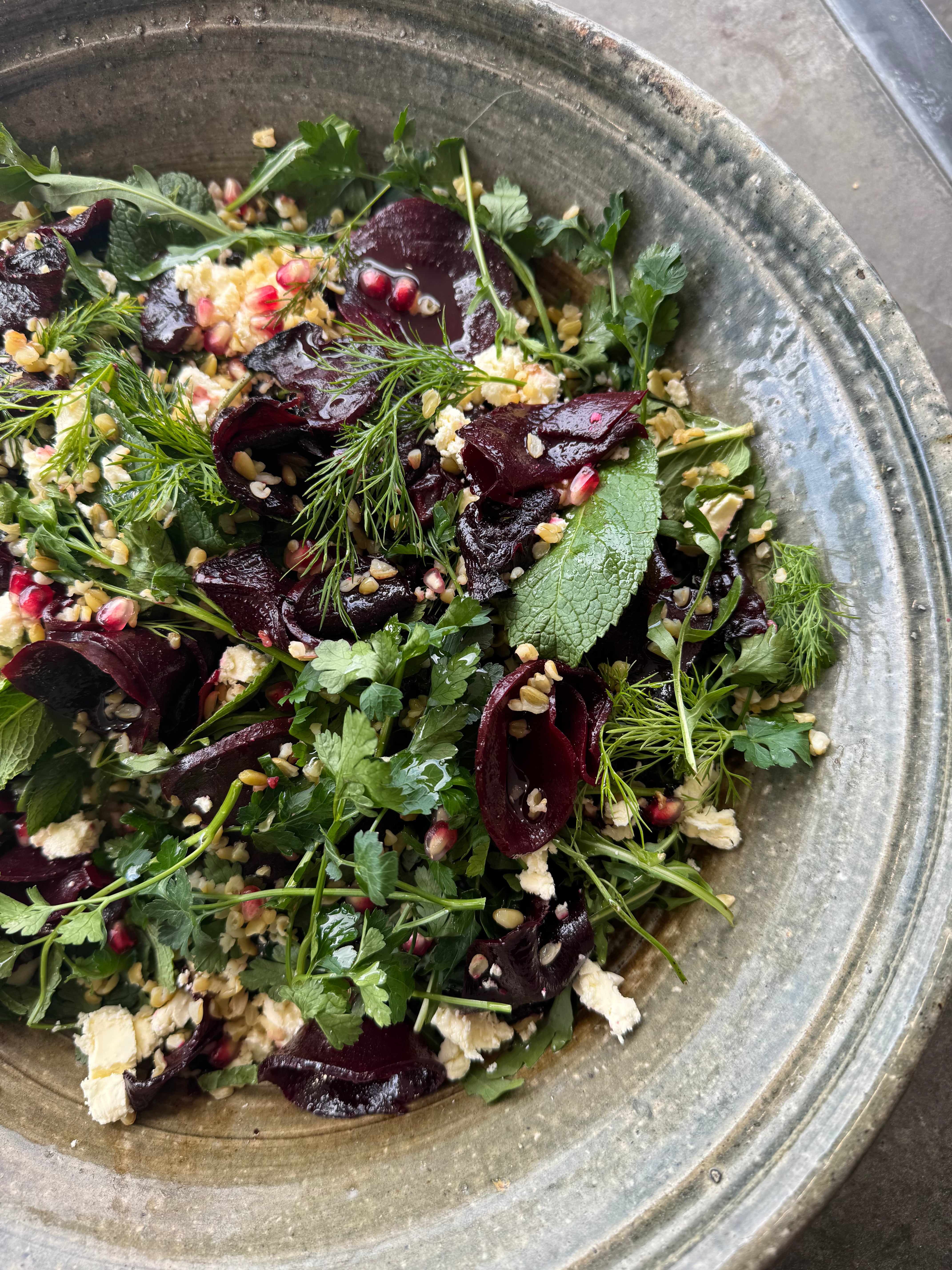 FESTIVE BEETS: Pomegranate-glazed beetroot, rocket, cavolo nero, freekeh, mint, parsley, feta, pistachio nuts, pomegranate seeds, orange and pomegranate dressing.  CONTAINS: NUTS, DAIRY, GLUTEN