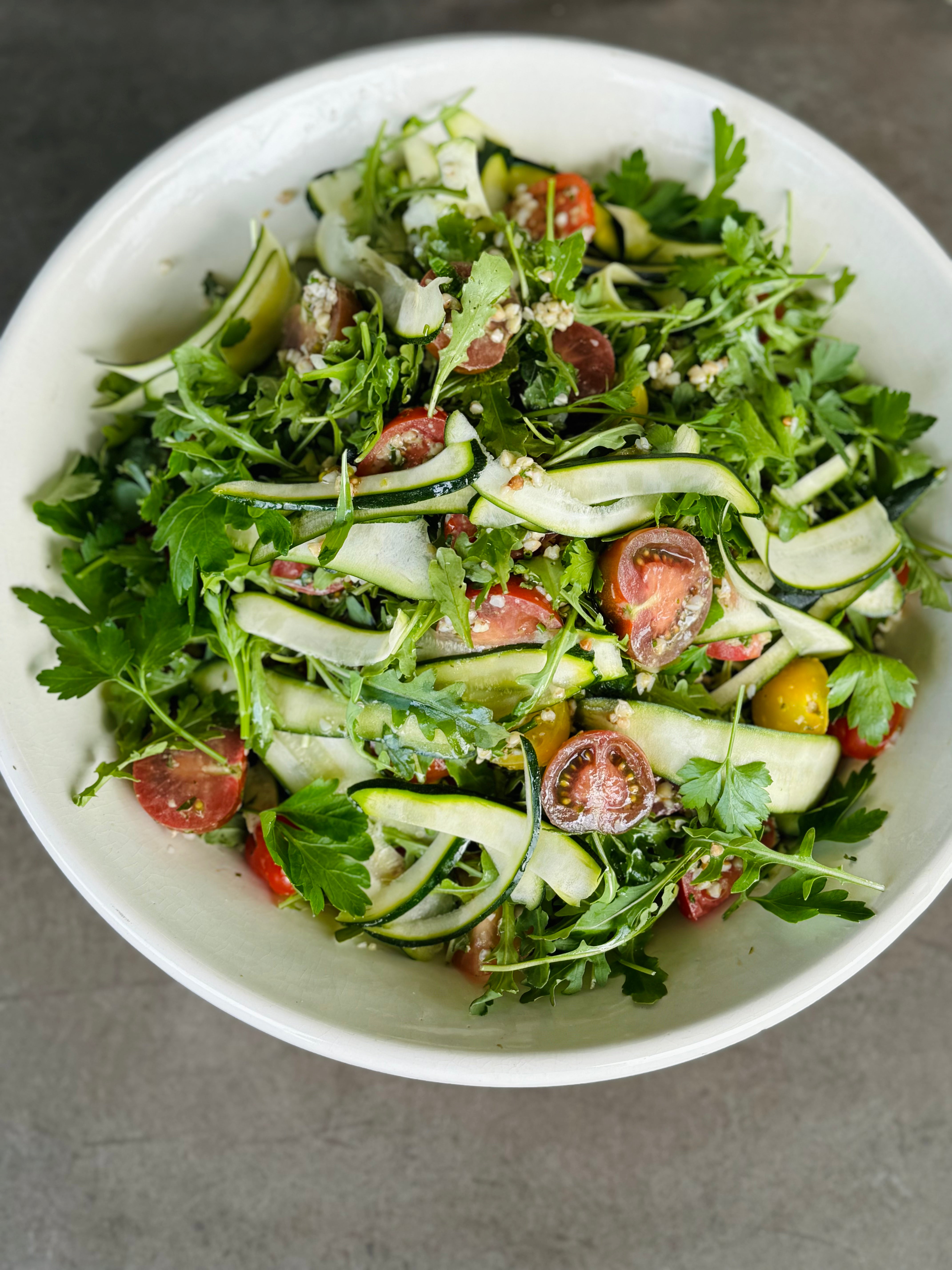 SUMMER GREENS: Asparagus (seasonal), broccolini, green beans, snap peas, avocado, rocket, Italian parsley, mint, basil, herby goddess dressing.