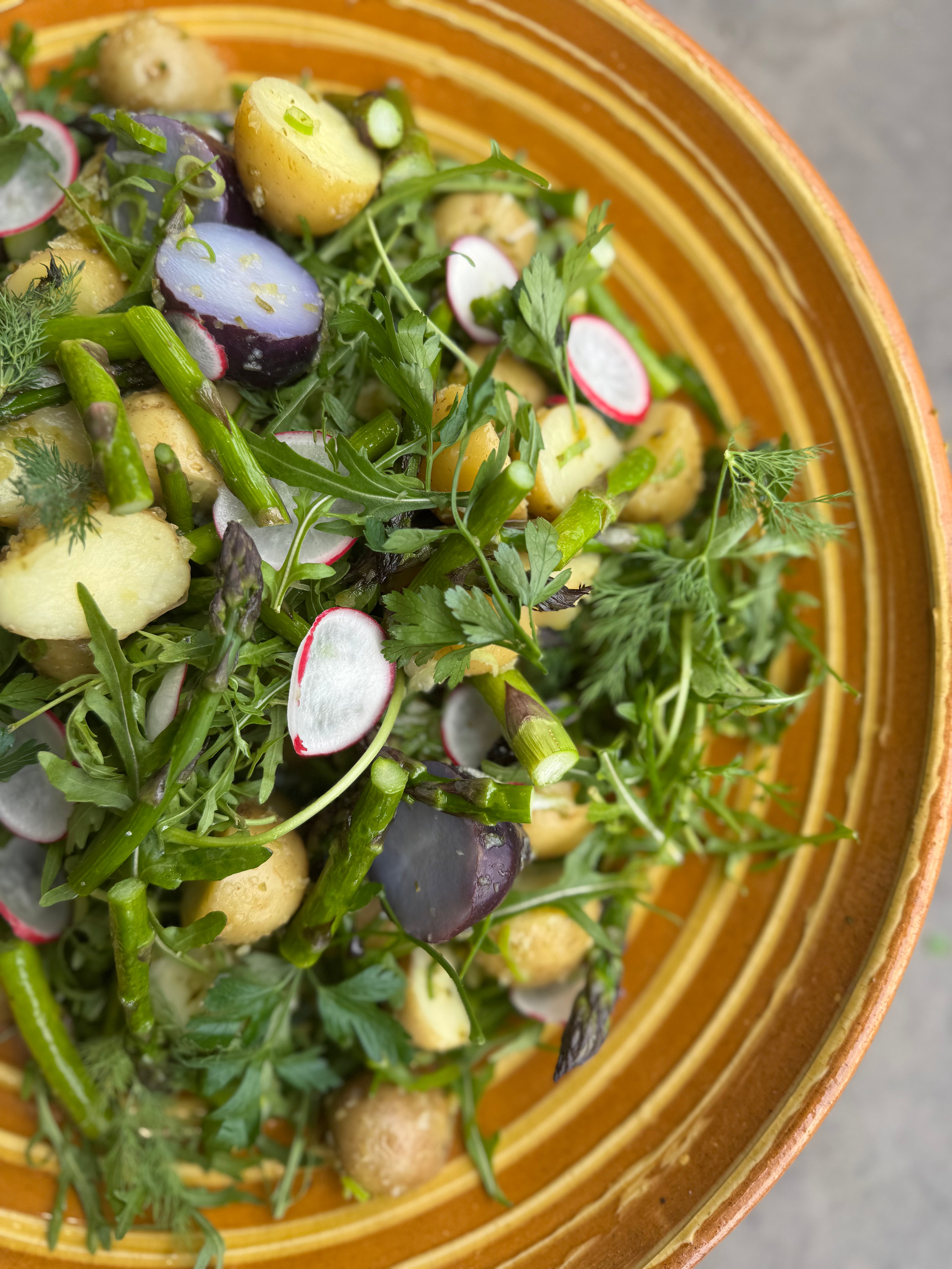 POTATO RANCH: New Season potatoes, gherkins, spring onions, radish, rocket, parsley, dill, asparagus, ranch dressing.  CONTAINS: DAIRY | MADE WITHOUT: NUTS, GLUTEN